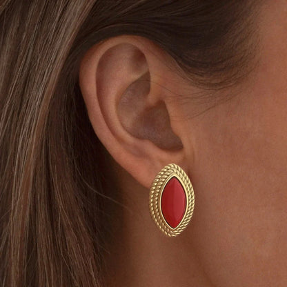 Gli orecchini Amaranta a forma marquise sono realizzati in acciaio inossidabile placcati oro 24k e smaltati in un bellissimo color rosso brillante. Leggeri, audaci per chi ha bisogno di arricchire il proprio outfit in maniera decisiva e sofisticata.