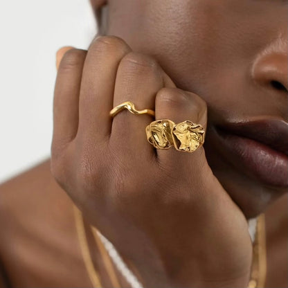 Lasciati ispirare dal set Elga + Frida e decora le tue dita da vera fashion addicted. Questi anelli sono regolabili e realizzati in acciaio inossidabile placcato oro 18K.