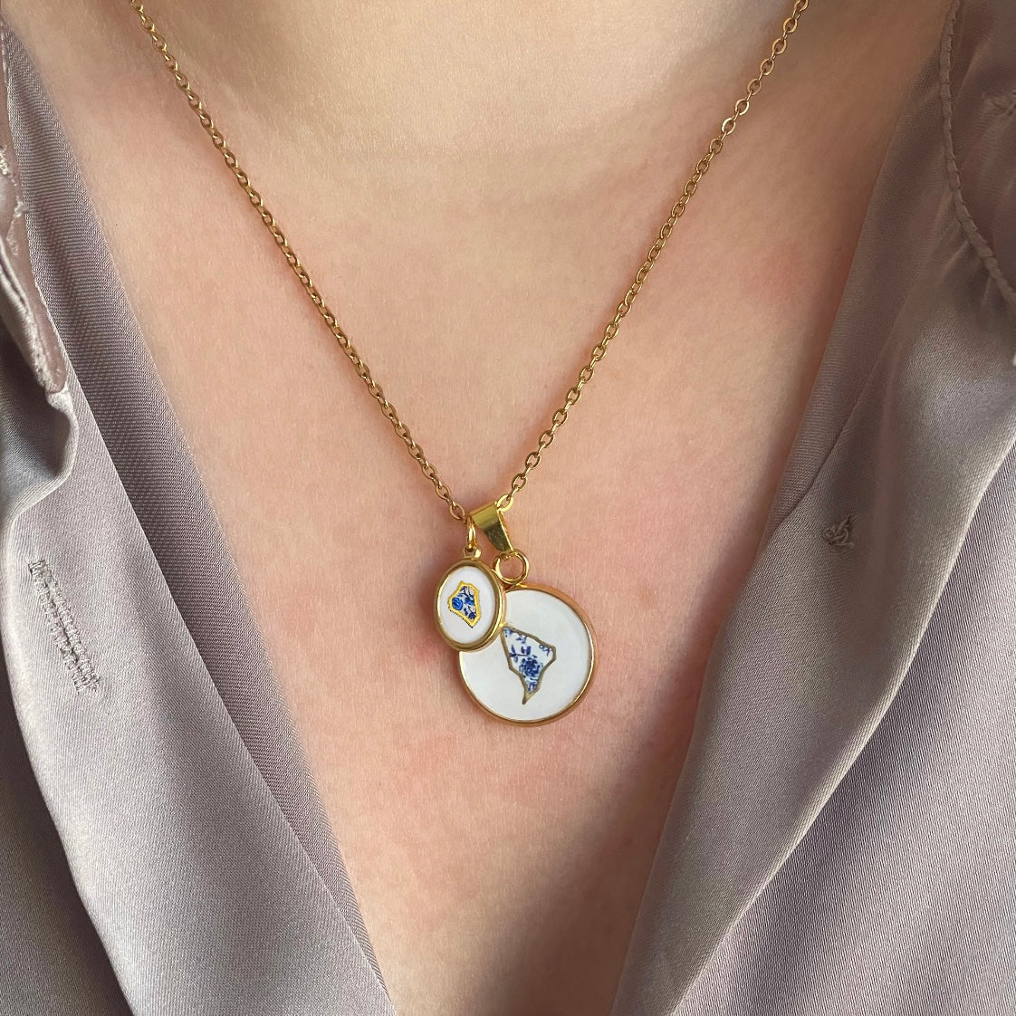 La collana è realizzata in acciaio inossidabile e placcata oro 18K, i suoi ciondoli artigianali raffigurano le ceramiche giapponesi nei toni del blu.