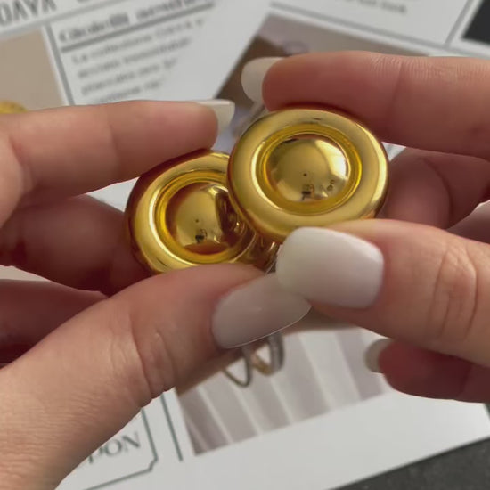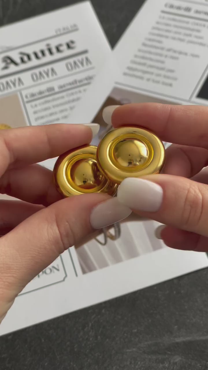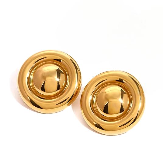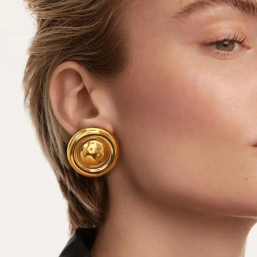Questi orecchini hanno una vera e propria allure vintage. Il diametro è di 2,85 cm. Lo stile è anni 50, perfetti con un outfit in stile old money. Sono realizzati in acciaio inossidabile placcato oro 18K, presentano una chiusura a farfalla.