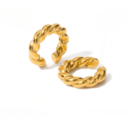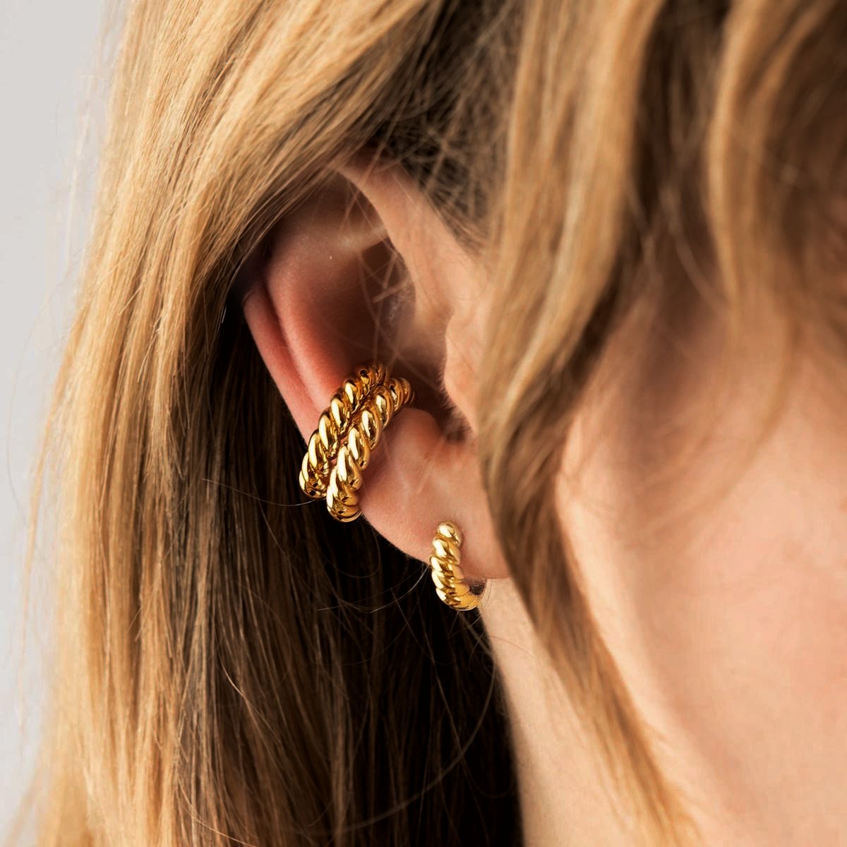 Lasciati ispirare dal set Odilia e decora le tue orecchie con l'eleganza senza tempo della coppia di ear cuffs e orecchini Odilia in acciaio inossidabile placcato oro 24K. Il design intrecciato che cattura la luce con ogni movimento è l'emblema della raffinatezza e del lusso, perfetto per aggiungere un tocco di classe a qualsiasi outfit.